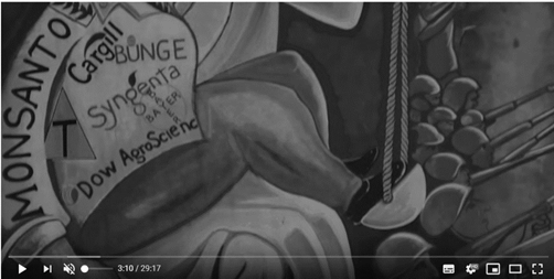 Na sequência, alguns dados referentes ao ano de 2013 são apresentados na tela do vídeo: o uso exacerbado de agrotóxicos; o monopólio da produção e comércio agrícola por parte de 30 empresas transnacionais; o favorecimento do agronegócio, em detrimento da agricultura camponesa; além da concentração de terras.