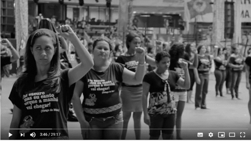 Ao mesclar teatralização com dados estatísticos, a subjetividade encarna a vivência da desigualdade e da exploração, dialogando com informações concretas e dados sobre o número de camponeses assassinados. Ao utilizar cenas de uma marcha promovida durante o Congresso de 2014, o vídeo integra a temporalidade da mística com as lutas concretas feitas pelo MST no espaço público e em torno da justiça social. A faixa anuncia a situação de violência no campo e, ao mesmo tempo, sedimenta pontos centrais para o projeto de Reforma Agrária Popular: a denúncia do uso exacerbado de agrotóxicos e da fragilização de um projeto de educação para o campo18.