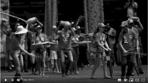 A narradora proclama que “o maior trem do mundo com suas engrenagens subtrai o tempo, a infância e a vida...Com muita miséria e destruição...Lá vai o maior trem e um dia não voltará”. Com machados nas mãos, repetem várias vezes: “Pancada de arrepio”. Posteriormente, no vídeo, alguns camponeses vestidos a caráter aparecem deitados no centro do ginásio, enquanto ouvem a repetição da frase “Arrepio, de pancada”25. O trem ganha materialidade e movimento com a formação de uma fileira de pessoas com roupas e guarda-chuvas, igualmente pretos, que são girados para acionar os mecanismos do maior trem do mundo.