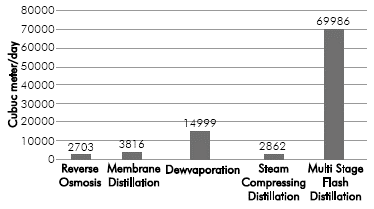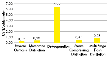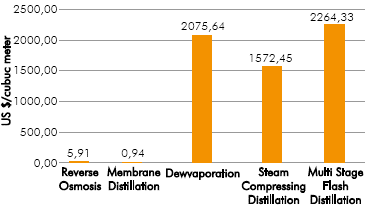 Likewise, it is observed that the Multi Stage Flash Distillation has the highest capacity to treat the Flowback per day (Figure 10). However, the pre-selected technologies such as the Membranes Distillation and Reverse Osmosis accomplish with the specified volume capacity for treatment; thus in an over dimensioned technology, investment would not be feasible from the economic view point. Fort the operation cost's case, Dewvaporation is the technology with the highest operation costs of all technologies (Figure 11); these costs are associated mainly to the maintenance of the treatment system, therefore this would be the first option to be discarded as high efficiency at lower cost is sought after.
