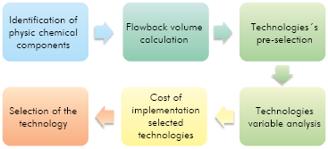 With the aim to select the more efficient technology (ies) for the treatment of returned waters for the non-conventional reservoirs in Colombia, the following methodology was developed encompassing six steps. Initially the identification of current physical chemical components has been discussed, present in the flowback through the geologic analogy between a Colombian formation and a foreign one, analysis of the fracturing fluids used in that foreign geologic formation and the analysis of the behaviour of the physical chemical components shown in the flowback. Later the flowback volume is calculated with the aim to preselect technologies. Then a study of operational variables is undertaken and the cost implementation, bringing the selection of the right technologies for the treatment of returned waters.
