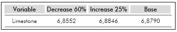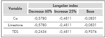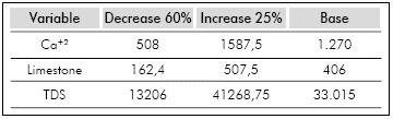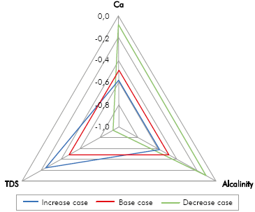 Aimed at establishing the physic chemical components affecting the stability indices as previously explained, a sensitivity analysis was carried out. The results can be observed in Figure 3 to Figure 6, noticing three scenarios: (1) Increase of up to 25% of sensitive variable, (2) Base case, and (3) Decreased down to 60% of the sensitive variable. The variable showing the larger dispersion in the increased and decreased scenarios relevant to the base value is the one affecting the stability index.