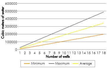 With the previous information, the required volume of water is calculated well by well for each one of the scenarios before mentioned, and in function of the number of stimulated wells.
