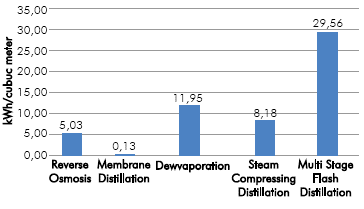 One alternative for this type of treatments is the Membrane Distillation (MD) whose main feature is the combination of thermal and physical processes to improve the water quality. The underlined benefits with this type of technologies comparing it to the Reverse Osmosis are (Minier-Matar, Hussain, Janson & Adham, 2014): 1) The quality of distilled water, obtained through simple steps different to Reverse Osmosis that requires multiple steps, 2) the quality of the product is not affected by salinity, and 3) low capital cost for its implementation due to very low cost of the construction materials.