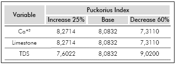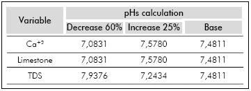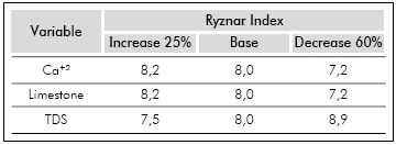 The term pHs is calculated in the same way as the Langelier index's, therefore the pHs values showed in Table 6 are valid for the Ryznar index. In this way the equation (9) is calculated in the Ryznar index: