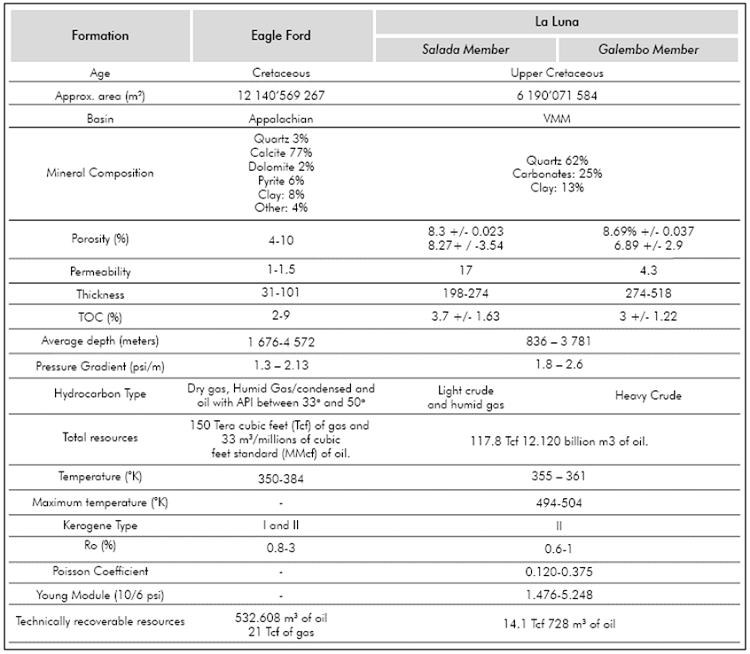 A foreign formation similar to a Colombian formation must be identified in this case, aimed at correlating the physic chemical features of the flowback. According to data as shown in Dong et al. (2014), Lesar (2011), U.S. Energy Information Administration (2011), Murphy (2013) and the characterization of the interval of the bottom of the well La Luna 1, carried out by the Instituto Colombiano del Petróleo (Center of Research, Development, Innovation and Technology-ICP) (2012) where was determined that La Luna formation located in the Magdalena Valley (VMM) and the Shale Eagle Ford, showed similarities in their petro physic and geologic features; as shown in Table 2. In order to establish the similarities between these two formations the following parameters were taken into account: permeability, porosity, TOC (Cerón, Walls & Diaz, 2013), type of hydrocarbons, type of kerogene, temperature and vitrinite reflectance (Ro). Comparing each one of the mentioned parameters between the two formations showed in Table 2, the similarities on data can be ratified.
