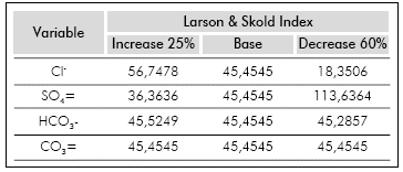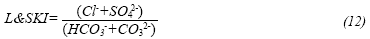 Larson & Skold index (L&SKI) This index considers chlorides, sulphates and total limestone. It is useful for balanced and purified waters, and especially cold waters. It does not work well with very low limestone waters (desalted waters) or very high limestone waters. If Index < 0,8 there is no corrosion. If 0,8 < Index > 1,2 there is a meaningful corrosion. If Index > 1,2 the corrosion is high. The calculation of this index is carried out in the following way (Guevara, 2013; Roberge, 2000):