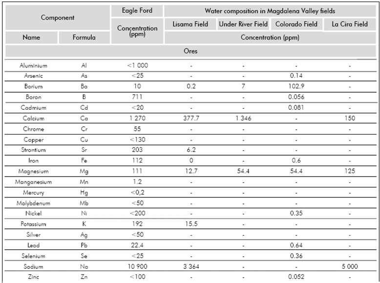 Once the shale Eagle Ford formation has been identified as the foreign formation analogue to the Colombian La Luna, it is assumed that the physic chemical composition of the flowback resulting from this formation in the United States is the base composition of the flowback in a non-conventional reservoir in the Colombian area. In Table 3 the flow back contaminants of the shale Eagle Ford and the water production of the Colombian fields located in the Magdalena Valley are compared, thus for the later works of this investigation, the data from the shale Eagle Ford will be worked upon.
