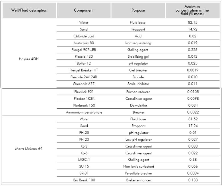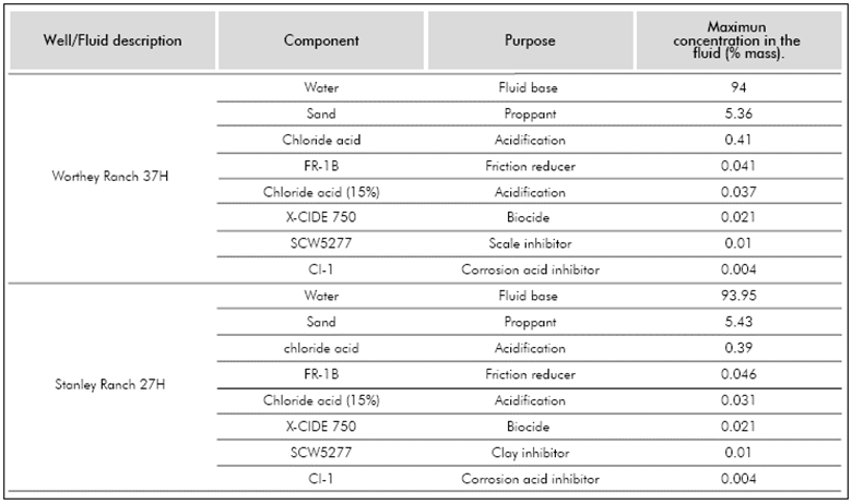 Amongst the more representative cases of fluid trends used in hydraulic fracturing, two companies are found: EOG and Anadarko. EOG has been active in Eagle Ford in most of the fracturing jobs through the use of hybrid fluids. This company has shown interest in avoiding chemicals specially, such as acids, clay stabilizers and surfactants aimed at optimizing its operations. This analysis cover the hydraulic fracturing jobs in 498 wells since the first of January 2011 to the 30th of September 2012. On their side, Anadarko has diminished the use of hybrid fluids, increasing the use of slickwater fluids in that shale play. This, as the company foresees tangible benefits using these type of fluids and based upon the production records and the reservoirs characterization (Robart et al, 2013). The composition of some fracturing fluids used in some wells by these two companies is shown as follows: