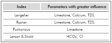 To analyze the behaviour of the physic chemical components of the flow back, four water stability indexes will be analysed allowing identifying whether the volume of water is aggressive, corrosive or incrusting. The water is aggressive when this volume has the tendency to dissolve the limestone incrustations. The water is corrosive when its physicochemical composition favours corrosion in a given ore. Finally, the water is incrusting when it has the tendency to form limestone incrustations.