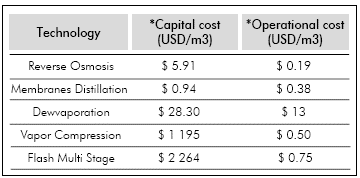 In this stage the viability of the implementation of the pre-selected technologies from the economic view point is assessed. It is important to take into account whether the technology is implemented on site or at a distance from the well, as this will imply changes in the final costs. In Table 8, the capital and operational costs in USD/m3 can be observed for each one of the pre-selected technologies. In this way it is possible to conclude that the best option from the economic focus would be Membranes Distillation Technology.