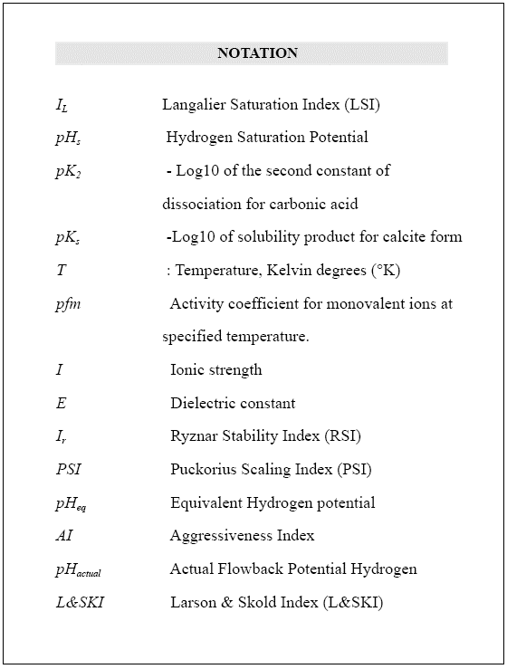 To analyse the behaviour of the physical chemical components of the flowback, four water stability indices will be analysed allowing identifying whether the volume of water is aggressive, corrosive or scaling. The water is aggressive when this volume has the tendency to dissolve the limestone scales. The water is corrosive when its physic chemical composition favours corrosion in a given metal. Finally, the water is scaling when it has the tendency to form limestone scale. Some methodologies for the calculation of scaling indices are illustrated as follows:
