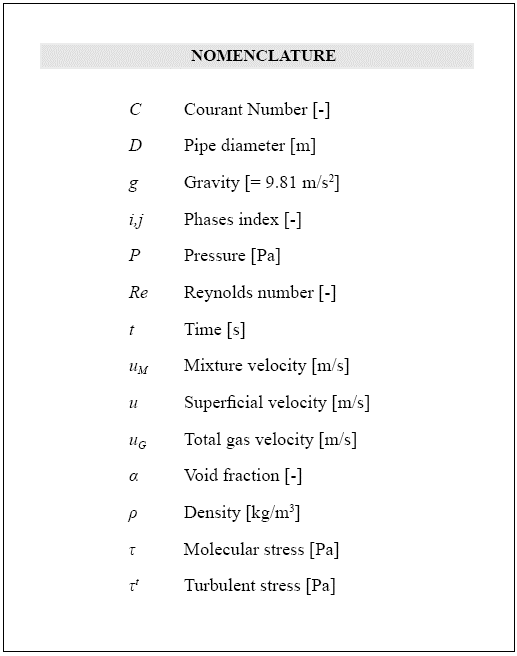 The gas-liquid two-phase flow involves transport of momentum, mass and heat. Nevertheless, heat transfer is omitted, setting the assumption that temperature is constant and uniform in the whole pipe. Hence, Eulerian and VOF models only consider mass and momentum transfers. The mathematical formulation for both physic models are detailed in this section.