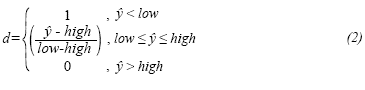 Where d is the desirability and varies from 0 to 1; and y is the predicted value of the response variable, "high" is a value above which the response is totally unacceptable (24 mg/kg for Total Contamination, and 500 ppm for moisture) and "low" a value below which desirability is a maximum. This equation applies to both total contamination and moisture. Subsequently desirabilities of the response variable are combined through the mathematical expression of equation 3: