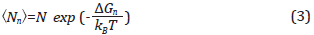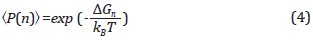 Where G(n) is the formation free energy of clusters which is a function of the number of the molecules of the cluster (n) and go is the energy for each molecule in the vapor phase. Nevertheless, ΔW could be read like the work of formation of a cluster in the system at constant temperature and pressure [47]. The value of n where the value of ΔG required for the phase change is reached corresponds to the critical cluster n*. This condition is considered as a transition state, as the formed cluster could continue to grow -a reduction of free energy- or could experiment disassociation (n <n* ).[28] Defined the probability function that describe the distribution of the critical cluster as P(n)=(Nn)/N, where (Nn) corresponds to the average number of the nucleus with n molecules, and N is the total number of molecules in the system. The value of (Nn) is established in terms of the free energy of Gibbs of the cluster, as: