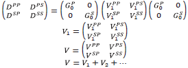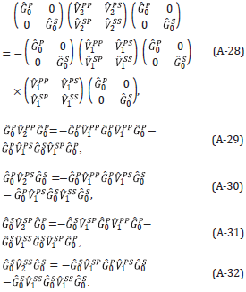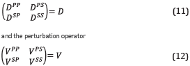 (generalizing Equations A-13 and A-14). Note that ^ indicates variables are transformed to PS space. This step loses contact with and violates the basic operator identity G = G0 + G0VG for the elastic wave equation. The fundamental identity G=G0+G0VG for the elastic wave equation is a non-linear multiplicative matrix relationship. For the forward and inverse series the input and output variables are matrices. The inverse solution for a change in an earth mechanical property has a nonlinear coupled dependence on \underline(all] the data components