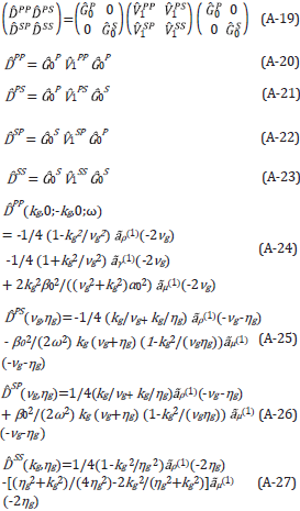 where ay[1], aμ[1], and ap[1] are the linear estimates of the changes in bulk modulus, shear modulus, and density, respectively. kg is the Fourier conjugate to the receiver position xg and vg and ηg are the vertical wavenumbers for the P and S reference waves, respectively, where