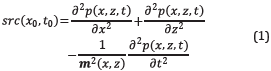 A mathematical expression for a single shot, src, of the wavefield measured at the surface in the time domain can be obtained with the numerical solution of the 2D acoustic wave equation with constant density given by