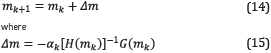 being Δm the search direction where G(mk) is the gradient that represents the evolution direction in the misfit function, H(mk) is the Hessian, which represents the magnitude of this direction, both evaluated at mk and αk is a scalar step length value.