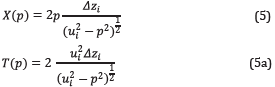 where u=1/v is the slowness, with v as the velocity of the layer and θ is the ray incidence angle (from vertical). The expression for the surface-to-surface travel time T(p) and the total distance X(p) for a constant layer are,