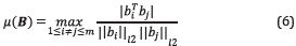 The mutual coherence of matrix B is the largest absolute normalized inner product between different columns of B[9], and it is given by