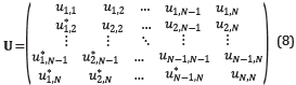 The matrix U can be expressed as the vector u=(u1,2,u1,3,…,u1,N,u2,3,…,uN-1,N) to compactly represent these elements. We use the notation uij to represent the element in the vector u that corresponds to the value of U at the location (i,j) and the definition of f(xn,tn) is expanded as follows: