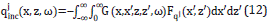 where S' is the boundary of the entire half plane and the Green's function depends on whether ki is complex or real. The functions Fqi (x,z,ω),i=0,1, are the Fourier transforms in time of the sources, given in the Equations 5 and 6.