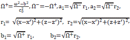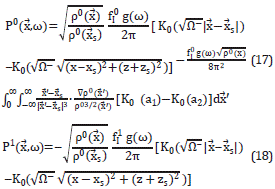 On this basis, according to [10], the pressure field is written in terms of modified Bessel functions of the second kind and zeroth order, denoted by K0. The argument of K0 involves the wave vector k' and c0, through Ω±, a1or a2. K0 is complex and, therefore, the final expressions for P' are real, and given by: