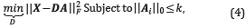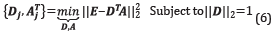 Where Dj and Aj means the j-th column of dictionary D and j-th row of coefficients matrix A, respectively; also Ej=Xj-Σ DjAj is the error matrix without the j-th atom , Dk is the updated atom and AA Tis the new coefficient in row Aj. This problem can be solved using SVD decomposition of the matrix Ej=U∧VT; the update D¡ is a first column of U and the multiplication of the first eigenvalue ∧(1,1) and first column of V is used to update the coefficient AJ.