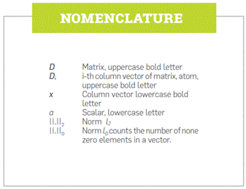 Sparse signal representation in over complete dictionaries is an analytic tool that has been satisfactorily implemented in multiple signal and image processing applications such as image compression [15], audio denoising [16], and seismic signal pre-processing [17]. Its principle basically consists in representing the signal of interest as a linear combination of a few columns from a previously specified redundant matrix called dictionary, where each column of this matrix is called an atom of the dictionary. To be precise, let us consider the discrete-time signal of interest denoted by the vector x G 5Rm; this signal can be represented as