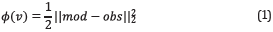 where v ϵ RNxxNz (for the 2D case) is the velocity model, obs is the acquired data and mod is the modeled data. Nx and Nz are the number of elements on the model in the x and z coordinates.