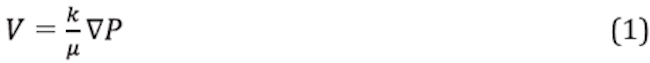 The procedure for obtaining a numerical model that calculates the pore pressure, including causes other than undercompaction, is explained below. The pressure equation is based on pore water balance. The force that drives the pore water is the overpressure gradient. Equation 1 shows Darcy's law in which a linear relation is established between the rate of discharge of the pore fluid, V, and the overpressure gradient, ∇P. The proportionality factor is mobility and its value depends on the permeability of the rock, k, and the viscosity of the fluid, μ.