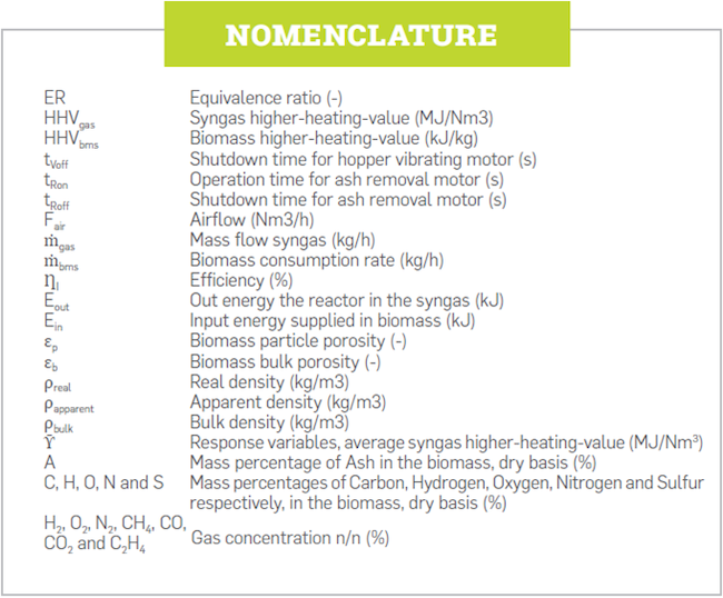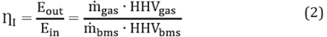 Process efficiency (ȠI) was computed as the rate between the output gas energy reactor and the input biomass energy supplied (see Equation 2). Efficiency does not consider the gas sensible energy, because gas usually needs to be cooled with water before being used in internal combustion engines. Gas flow was computed in accordance with the methodology presented in [19].