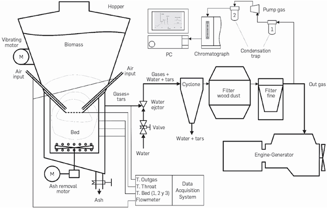 The storage hopper has a vibrating system that keeps solids flowing downwards, and two air inputs at the bottom for feeding air to the combustion zone. The hopper has a throat at its bottom, and under the throat there is a two-wall cylindrical reactor where reduction reactions take place. Next to the combustion zone there is a grate; gas and ashes cross this grate when leaving the reactor. To allow air and gas to flow through the gasifier bed, a water ejector system is used. This enables reduction of the pressure at the gas exit, inducing gas flow through reactor. In addition to its gas drag function, water also helps remove fine ash and tar impurities from the gas. Shaking and ash removal systems have electrical motors with programmable on-off switches. The shaking motor makes it possible to set the switch-off time only while the on-time was defined at 60 seconds by the manufacturer. Meanwhile, the ash removal motor allows you to set both on and off switching times.