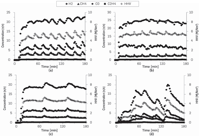 HHVgas for each test was computed as the arithmetic average of the heating values measured during quasi-stable conditions. This parameter was estimated indirectly using the gas concentration (x) and the heating value of each fuel species present in the gas (see Equation 1). These samples were analyzed trough gas chromatography every 3 minutes.