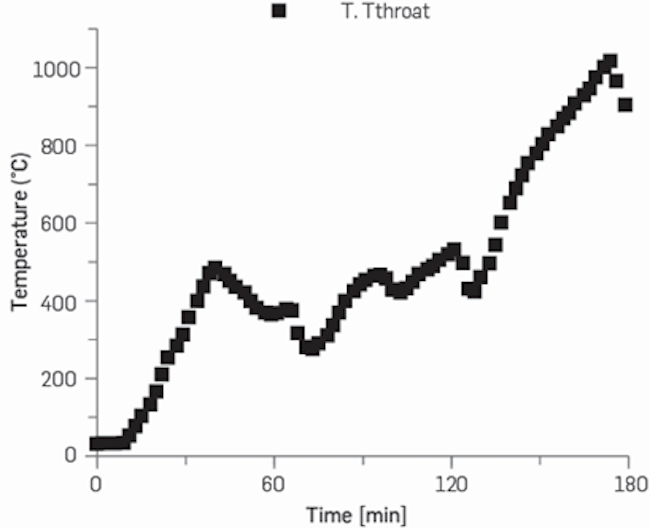 Figure 4 shows different gas concentrations and its HHV at runs 1, 3, 4 and 6. The relationship between shaking system operation and species concentration profiles is highlighted (see Figure 4a and 4c). This is because when the vibration system is on, fresh biomass goes into the oxidation zone, decreasing process temperature. On other hand, a reduction was found in process variation at high airflows (see Figure 4a and 4b). As the airflow increases, oxidation temperature and the flame-front thickness increases, along with a reduction in temperature variations, hence process stability increases.