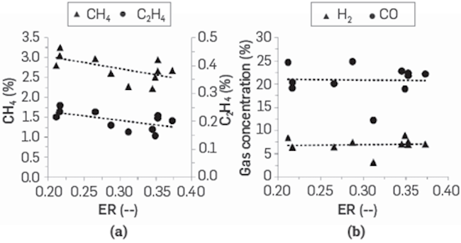 Figure 7 shows fuel gas species concentration measured during experiments. Methane and ethane decrease as the ER increases. This is related to the increase of air entering to the process. Hydrogen and carbon monoxide do not exhibit a defined trend as a function of this parameter, which means that process instabilities have a considerable effect on the formation of these gases.