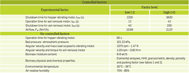 The main aim of this work was to determine the effect of the operational variables, shaking time, ash removal and airflow on gas HHV, efficiency and biomass consumption rate. A factorial experimental design 24-1 (fourth factors, three levels and three central points) was developed for this purpose.