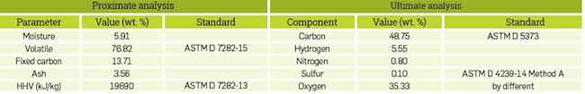 Biomass chemical properties were obtained in line with ASMT standard procedures (See Table 2). The proximate analysis was carried out in accordance with standard ASTM D 7282-15 and determination of the HHV in kJ/kg was carried out as per ASTM D 7282-13. Ultimate analysis was carried out in an elemental analyzer, Exeter Analytical CE 440, adapted to the ASTM D 5373 standard, sulfur content with ASTM D 4239-14 Method A and oxygen content was obtained by difference.