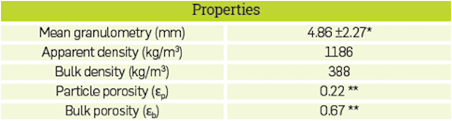 The physical properties of the biomass were measured experimentally and they are presented in Table 3. Apparent and bulk densities were computed according to ASTM E873 - 82 (2013) standards and Lenis et al [19] suggestions, respectively. Real biomass density was chosen as 1500 kg/m3 and it is a constant for most wood cells; it can be measured with a pycnometer according to ASTM D854-14 (2014) or estimated using ultimate analysis and the real density of its constituent elements [23]. Biomass porosity Ep and bulk porosity εb, were computed using Equations 4 and 5, Granulometric analyses were carried out using square sieves as per the INVE-123-07 standard. This methodology was used previously in [24]. These properties and the following results could be used to validate gasification models considering similar conditions presented in this work.