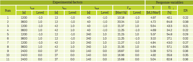 Regarding the HHV of the gas, shaking off-time (tVoff) has a significant contribution but the airflow (Fair) and ash removal time variations do not exhibit a noticeable effect on the process. Similar results were found for the equivalence ratio. Airflow had the most significant effect on process efficiency (ȠI).