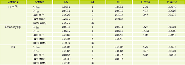 Tables 4 and 5 show results for palm shell gasification under the conditions presented in Table 3. Results analysis was performed following two different approaches. First, the significance levels of each factor on the equivalence ratio, HHV of the gas and process efficiency were stablished. Then, the equivalence ratio effects on the main process performance parameters were analyzed.