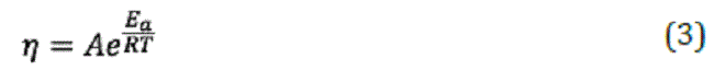 where A is a preexponential term (mPa⋅s), Ea is the activation energy (kJ⋅mol-1 ), R is the gas constant (8.314 J⋅mol-1⋅K-1 ), and T is the temperature in Kelvin. Using this method, the viscosity sensitivity to temperature can be summarized with a single number. Equation 3 can be linearized by applying a natural logarithm to both sides of the equation and by considering 1/T as the independent variable.