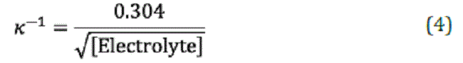 The Debye shielding Length can determine the degree of shielding caused by ions in solution, k1. For a 1:1 electrolyte at 25°C, this Length can be simplified to Equation 4 [41], where ["Electrolyte"] is the molal salt concentration (mol.kg-1), and k1 is in nm.