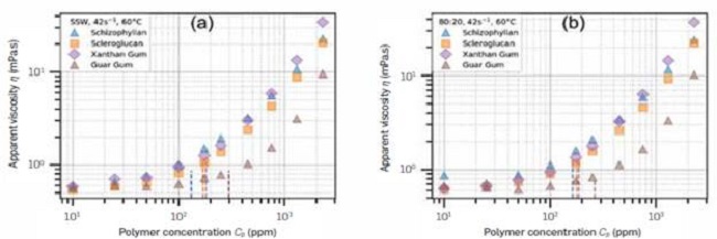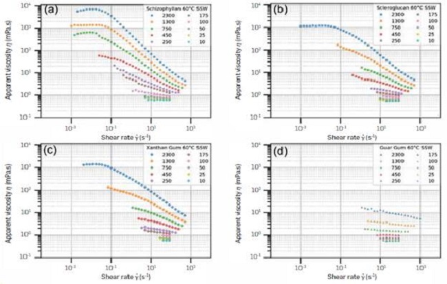 Scleroglucan, Schizophyllan, and Xanthan Gum have very similar behaviors. Schizophyllan showed the highest viscosity of all biopolymers at the same concentration, especially at lower shear rates, suggesting its potential use as an EOR additive.