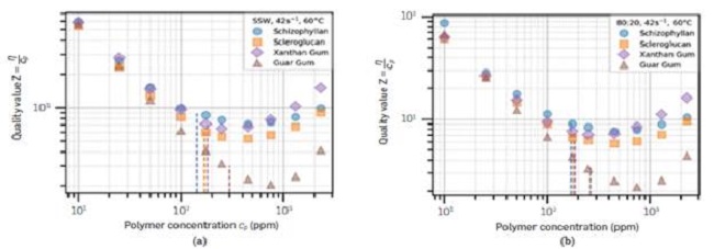 Another way of visualizing the differences between the polymers is by fixing the shear rate and comparing the viscosity differences. That has to be performed on a shear rate that presents useful rheological data in all conditions for a better comparison. Figure 2 shows the viscosity versus polymer concentration at 42 s-1 the reference shear rate value that is common to all concentrations of all polymers studied, in SSW and 80:20 brine, at 60°C. The dashed Lines indicate the calculated mean overlap concentration.