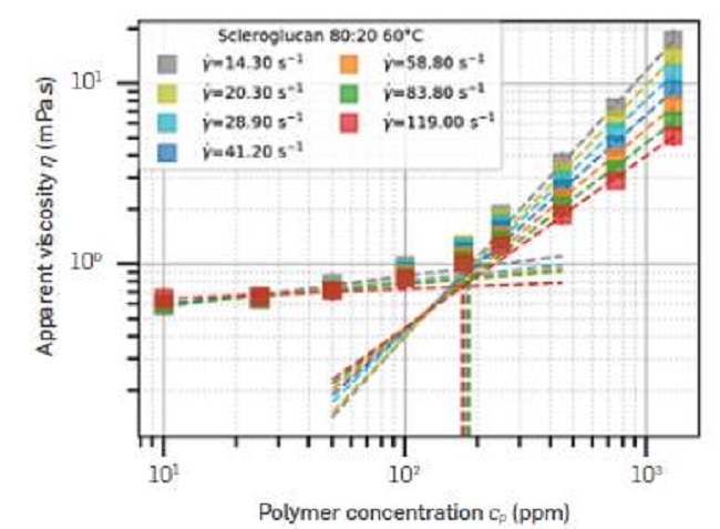 Figure 4 shows an example of the c* determination using Scleroglucan at 60°C in 80:20 brine. Repeating this procedure for all polymers and all concentrations, the c* of every polymer under all conditions can be compared. The small vertical bars over the symbols represent the region considered for each linear fit, which is represented by dashed lines. The vertical line down to the abscissa represents the intersection of both fits.
