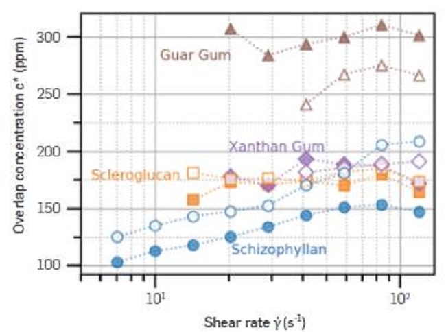 The 100 ppm c* difference between Guar Gum and the other polymers is probably due to the smaller molar mass and the random coil conformation of Guar Gum compared to the other polymers rigid rods that can be visualized by the ratio between the radii of both flowing molecules. That can be roughly estimated from the c*values [c*≈N/R3F). Supposing the molar mass of Guar Gum as 2 MDa, of Scleroglucan as 4 MDa (upper range for Guar Gum and middle range for Scleroglucan), and assuming that both have similar quantities of sugar groups for the same Length, a ratio