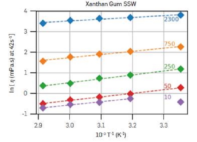 Temperature control is of great importance in rheology, as viscosity generally varies exponentially with temperature. The activation energy was quantified by a Linearization of the Eyring equation Equation 3. Figure 6 shows one example of Xanthan Gum in SSW at 25, 40, 50, 60, and 70 °C. The viscosity used was at y=42s_1, for it is the shear rate that most experiments have in common. The dashed Lines represent Linear fits.