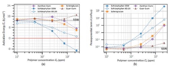 All dilute polymer solutions have activation energies close to water, which is due to their minute concentration. As the concentration ncreases, a few divergences appear. Guar Gum becomes more affected by temperature than water, whereas Xanthan Gum Scleroglucan, and Schizophyllan were Less. The activation energy of Schizophyllan in SSW became negative at higher concentrations, a physically impossible value which means the viscosity would become more elevated. However, this was performed without considering the viscosity at 70 °C, deviating from the Linear trend. If the deviating data point is considered, the trends of 80:20 brine and SSW will overlap and approach Ea=0 at higher polymer concentrations.
